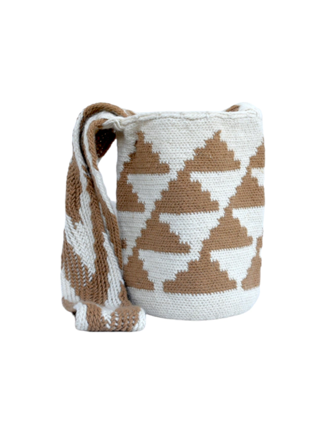 Mochila de lana tejida a mano por artesanos de la comunidad Kankuama en la Sierra Nevada de Santa Marta. Tamaño pequeño perfecto para llevar tus elementos esenciales y usar de día o noche.